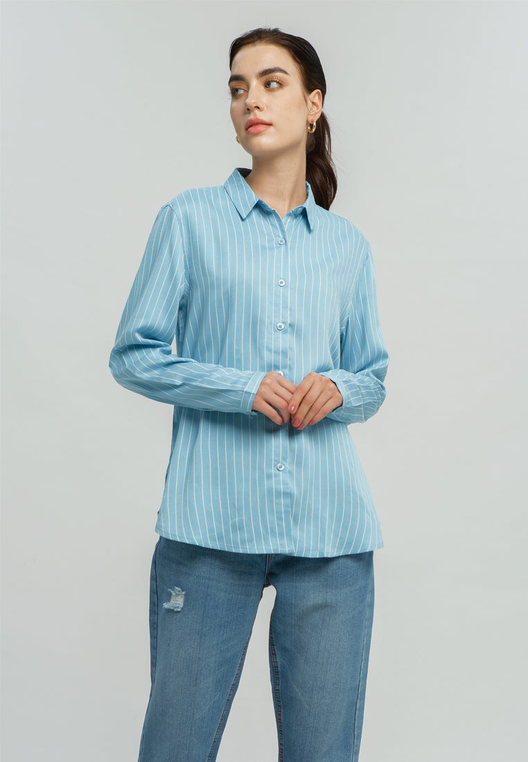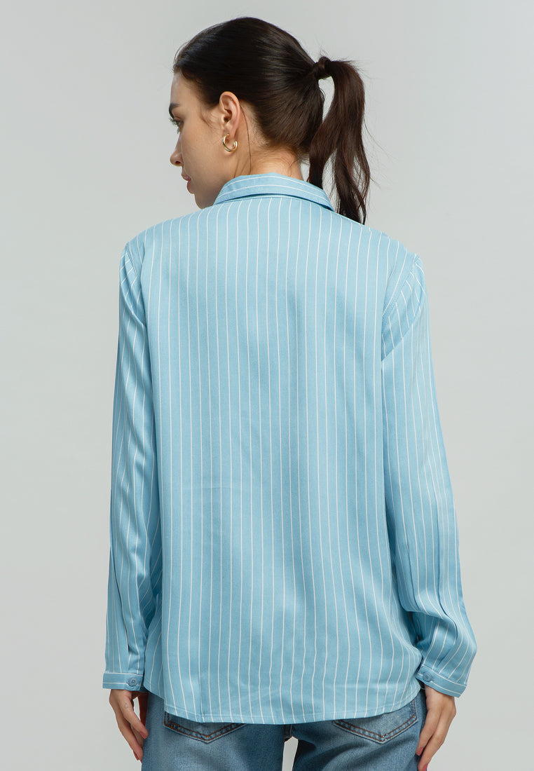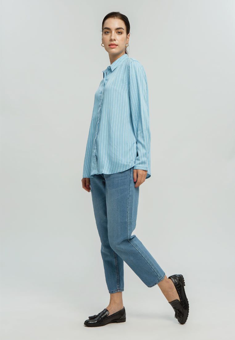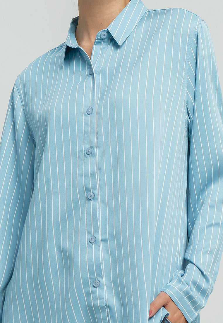 Kemeja Basic Lengan Panjang Biru Salur