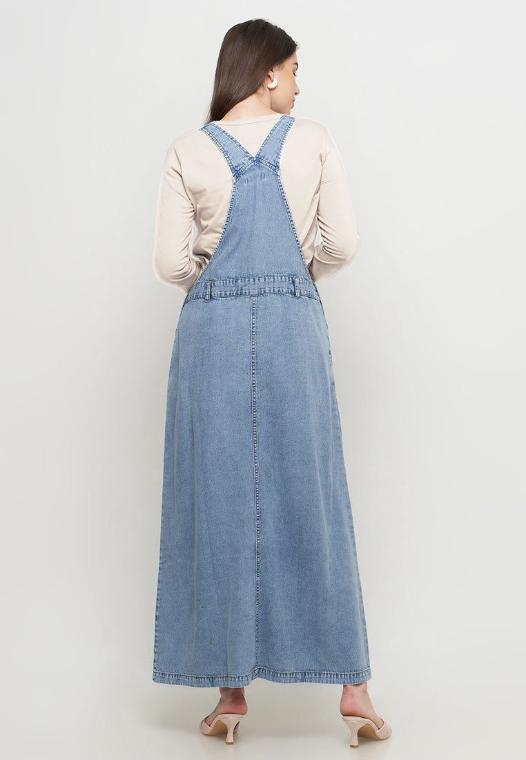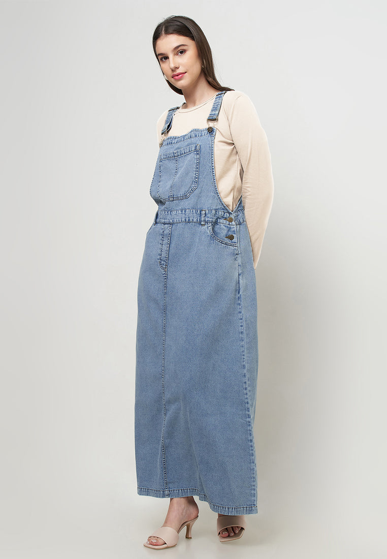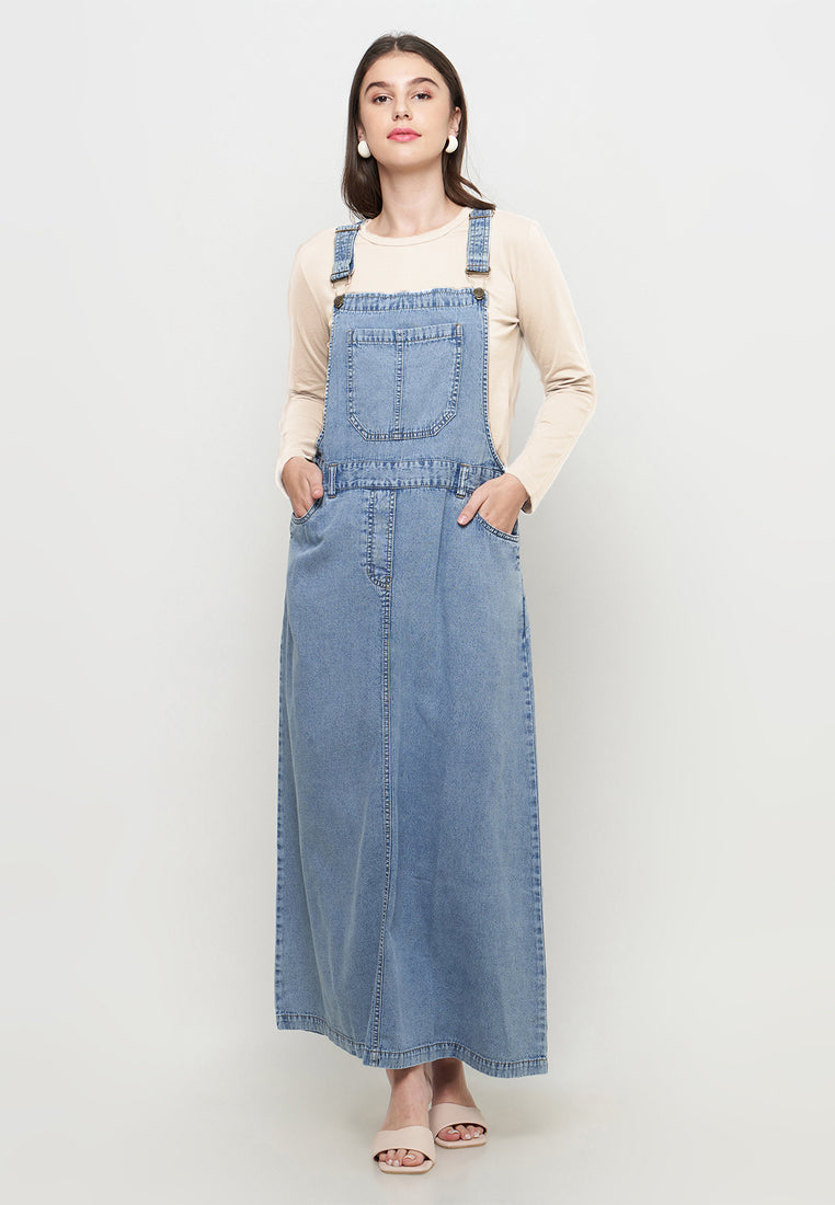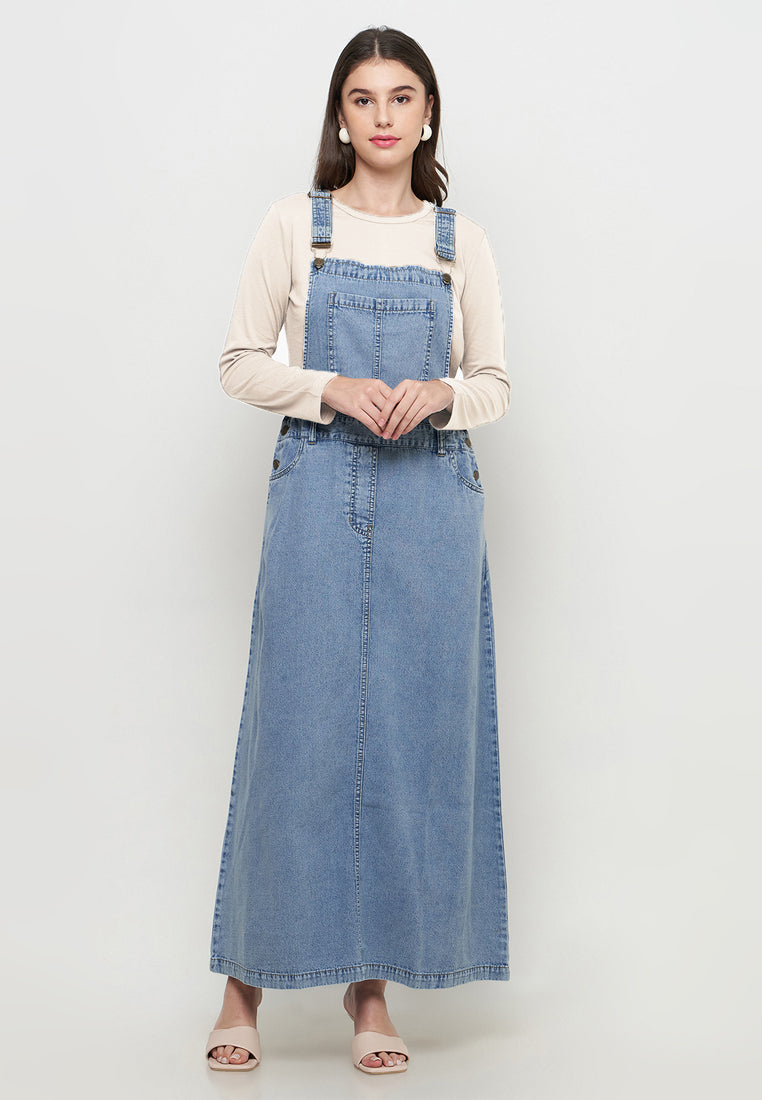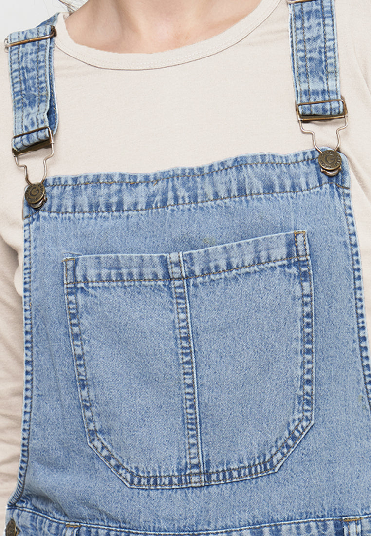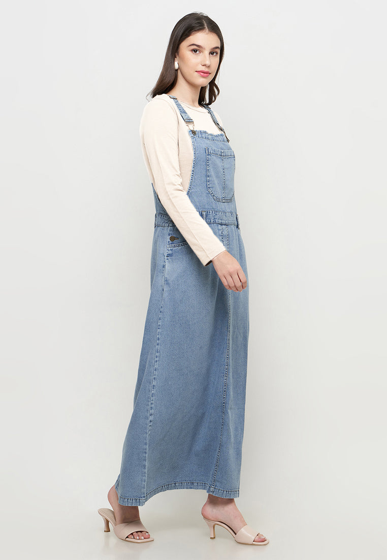 Two Pieces Overall Denim+Kaos Lengan Panjang Cream